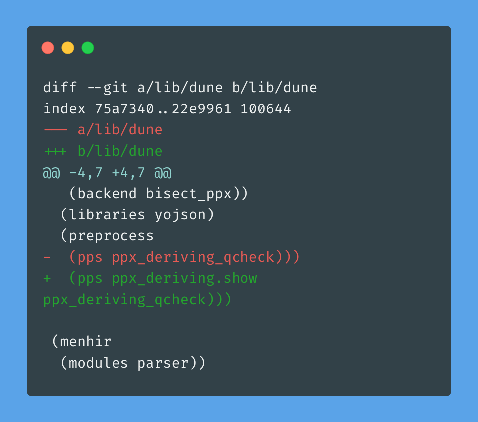 Sometimes we want to see a data type in the console in its raw form. We could implement a function to do that ourselves, but it’s repetitive and boring. Enter ppx_deriving.show: