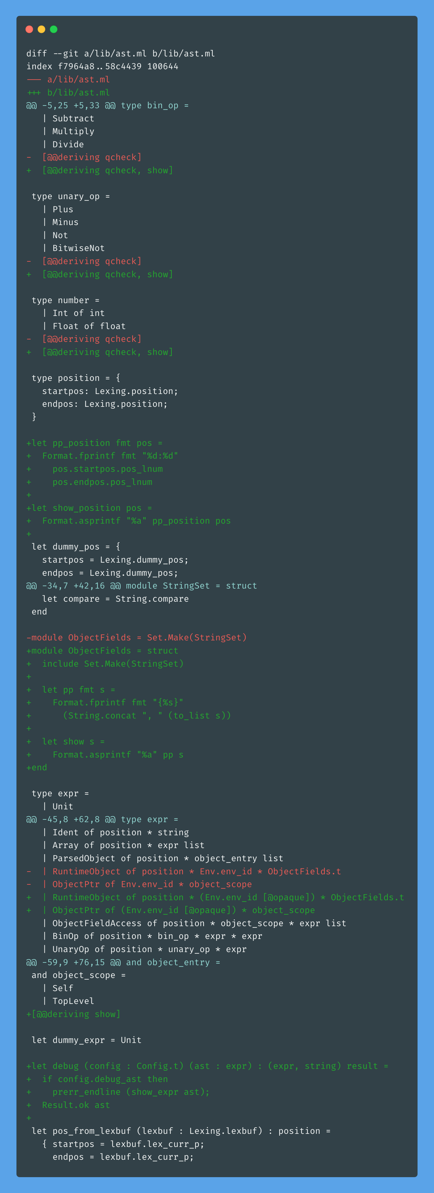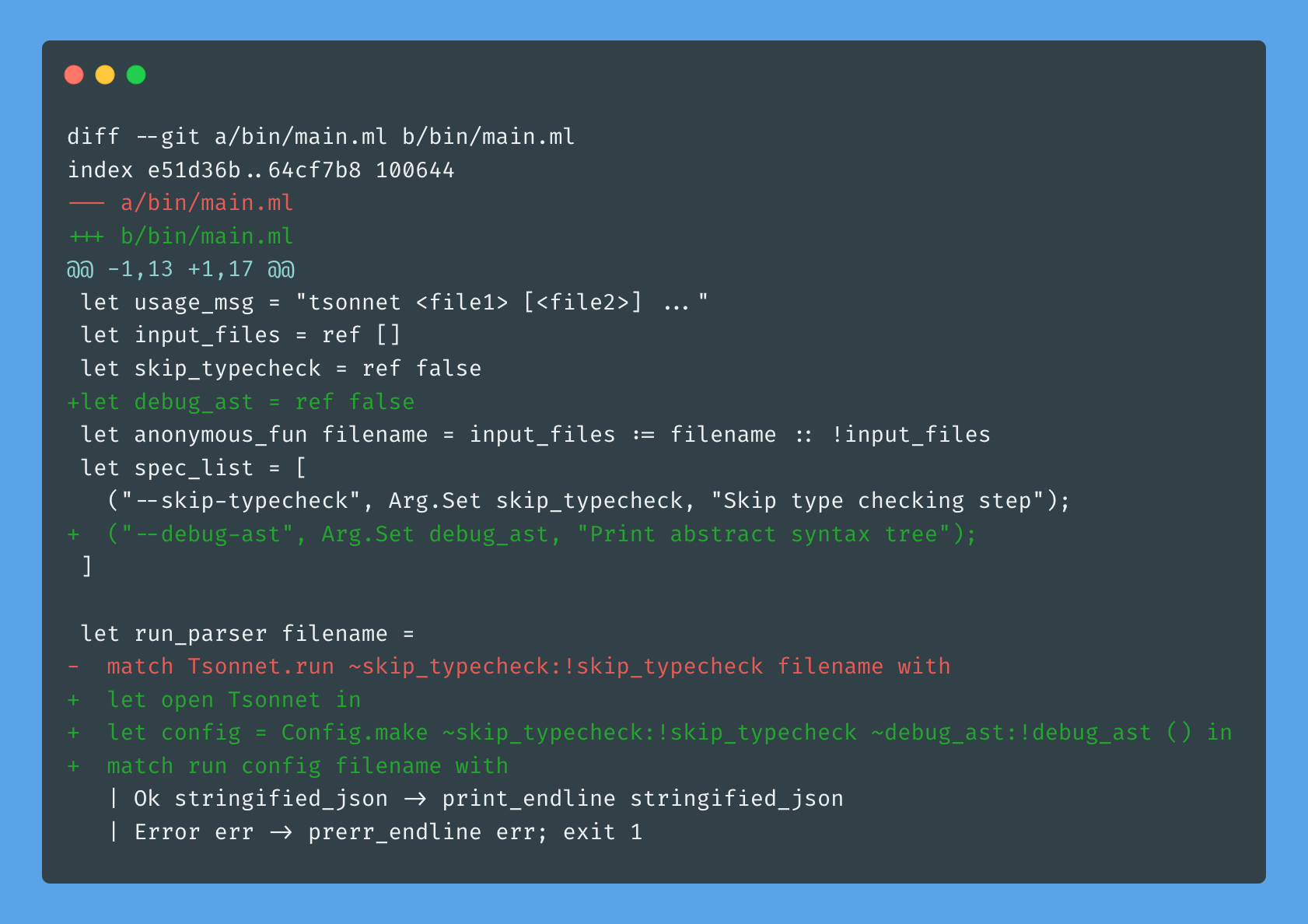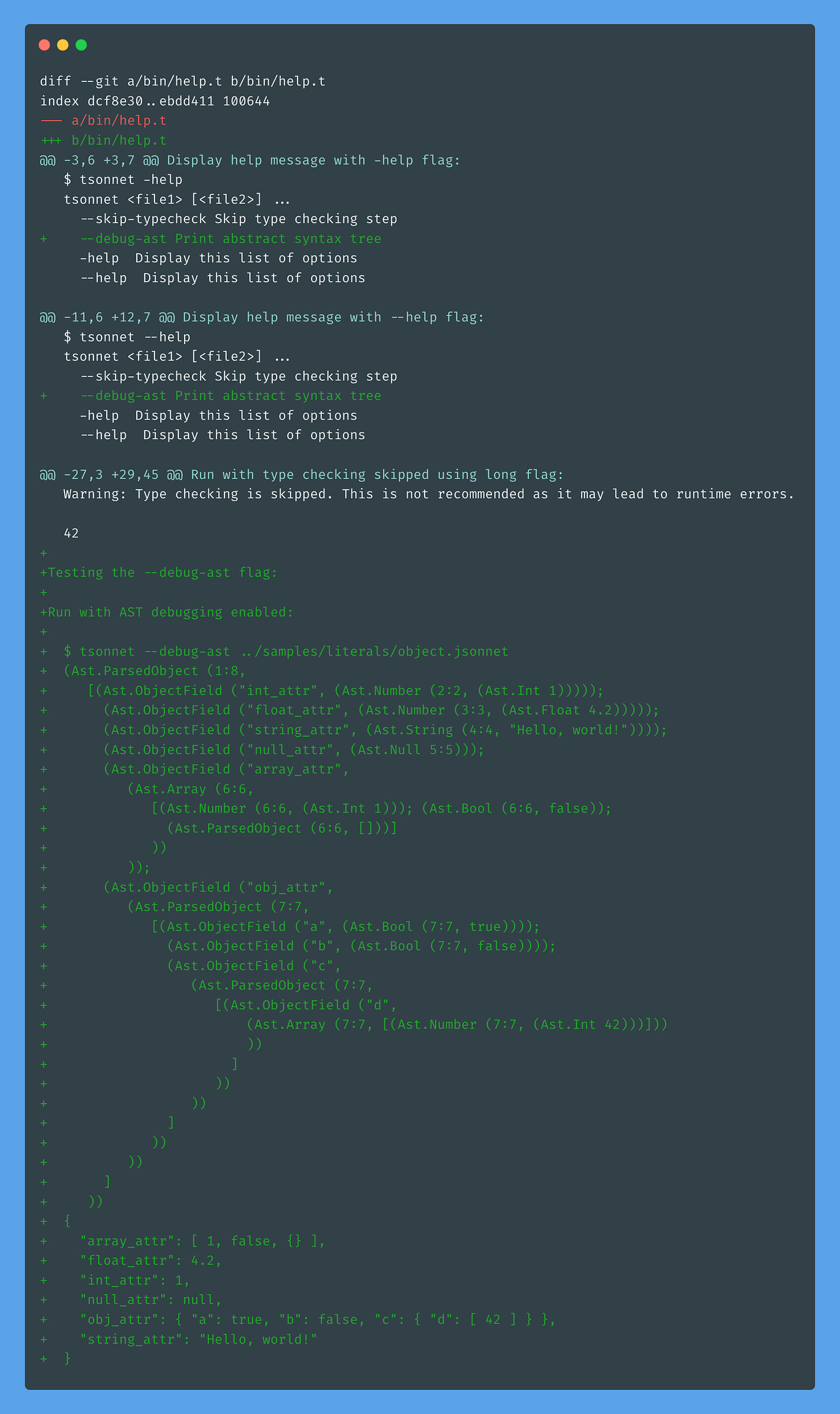 With ppx_deriving.show and a new --debug-ast flag, debugging Tsonnet just got a whole lot easier. And consolidating configuration into a Config module keeps the API clean as more options get added.