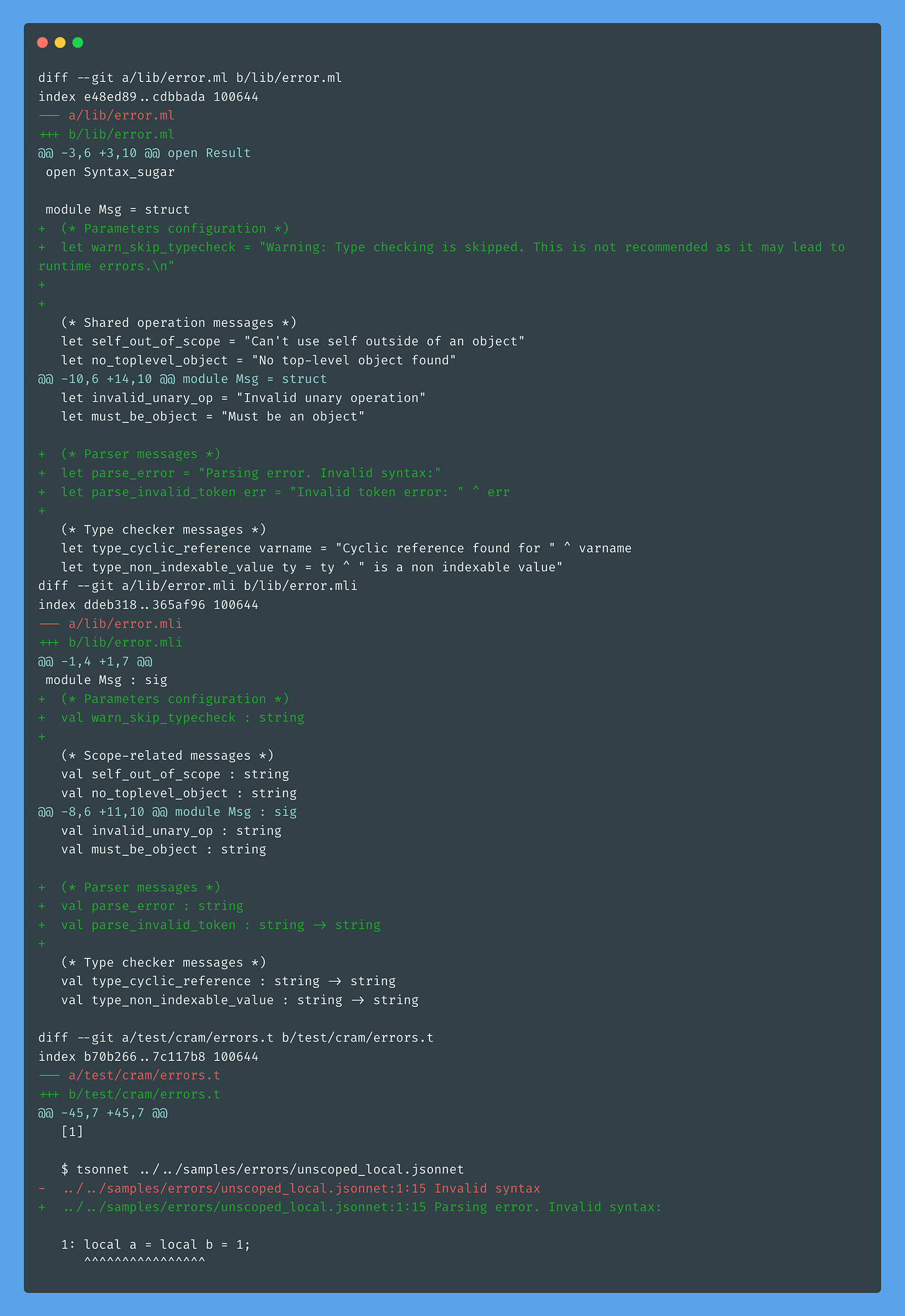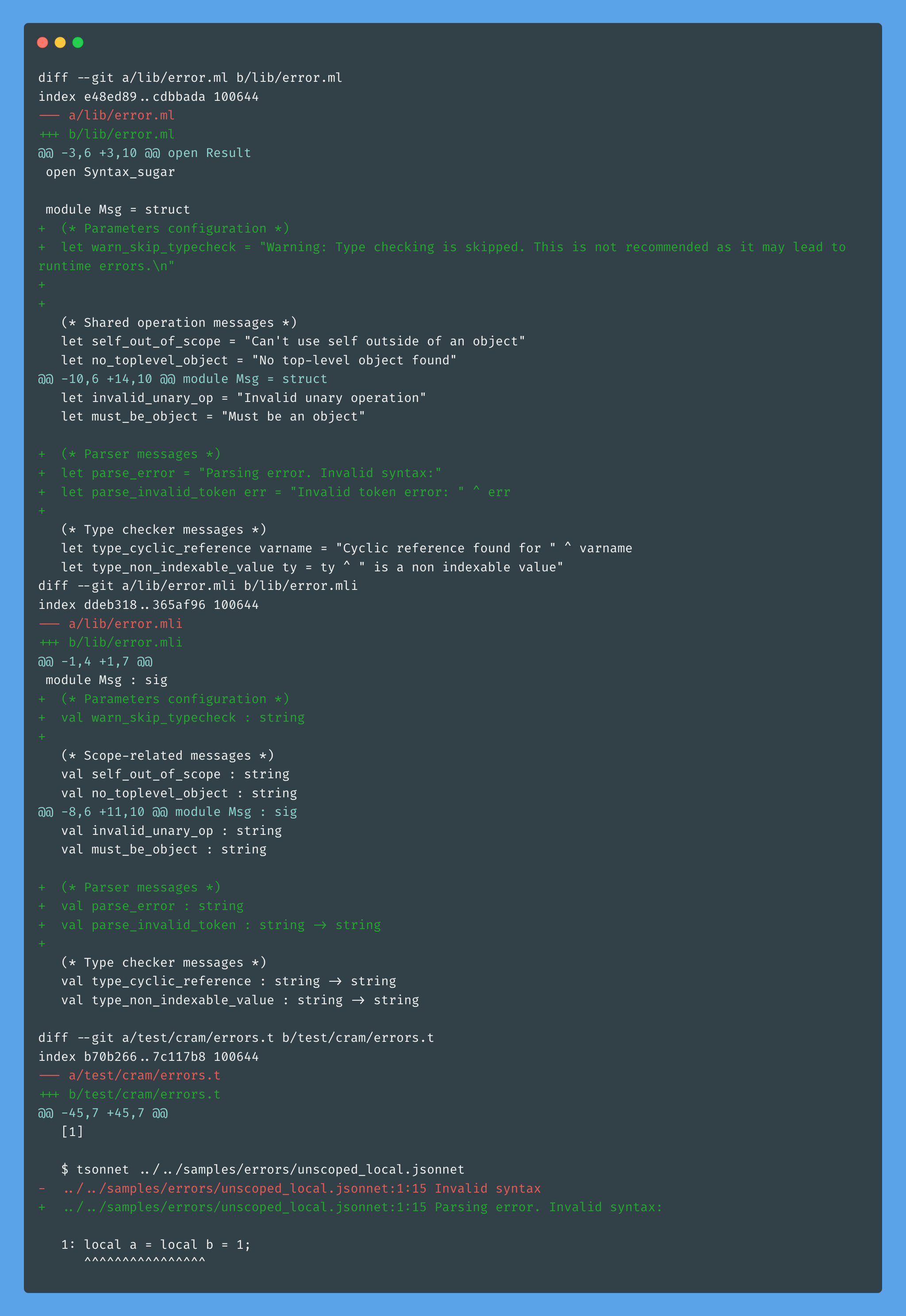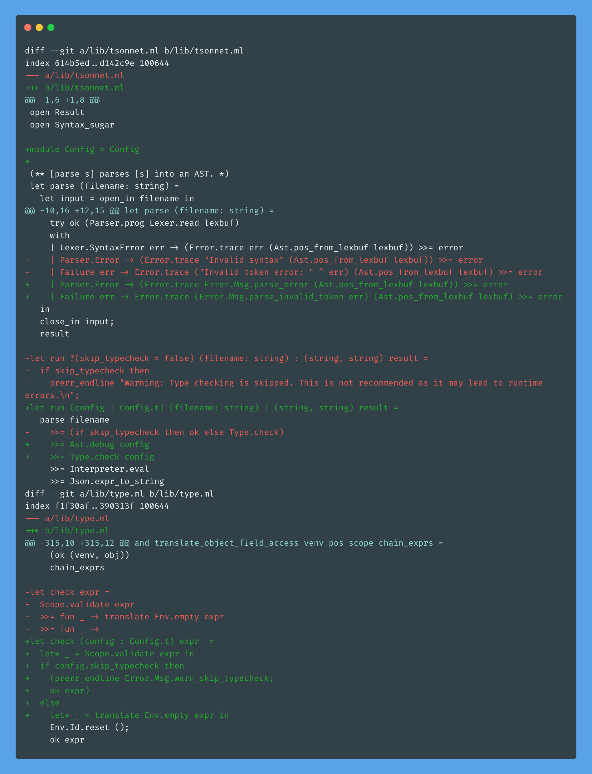 With ppx_deriving.show and a new --debug-ast flag, debugging Tsonnet just got a whole lot easier. And consolidating configuration into a Config module keeps the API clean as more options get added.